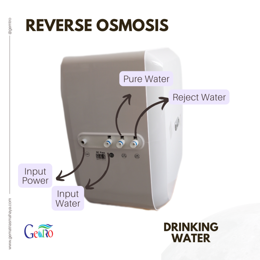 Salah satu metode pemurnian air yang paling pasti adalah metode reverse osmosis . Reverse osmosis memurnikan udara menggunakan membran dengan pori-pori 0,0001 mikron. Dengan kerapatan sekecil itu, membran reverse osmosis mampu menyaring protozoa, bakteri, virus, kontaminan kimiawi dan berbagai logam berat yang umumnya ada di air’.